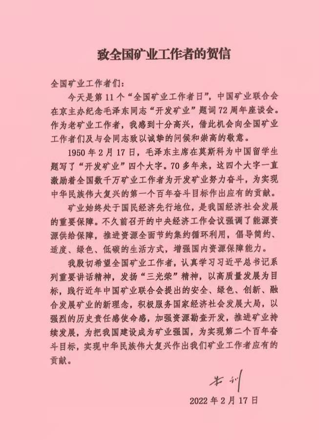 今年,2月17日是毛澤東題詞“開發(fā)礦業(yè)”72周年,又是第11個(gè)“全國礦業(yè)工作者日”,在這個(gè)特殊日子里,中國礦業(yè)聯(lián)合會(huì)等單位在北京舉辦紀(jì)念毛澤東題詞“開發(fā)礦業(yè)”72周年座談會(huì),來自行業(yè)管理部門、相關(guān)行業(yè)協(xié)會(huì)、省級(jí)礦業(yè)協(xié)會(huì)(聯(lián)合會(huì))、礦業(yè)企業(yè)嘉賓,中國礦業(yè)聯(lián)合會(huì)會(huì)員單位和礦業(yè)工作者等代表參加了本次活動(dòng)。新疆礦業(yè)聯(lián)合會(huì)組織行業(yè)管理部門、礦業(yè)企業(yè)、地勘單位的代表參加了線上會(huì)議并進(jìn)行了座談交流。