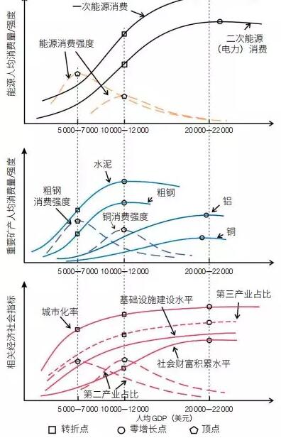 伴隨著社會財富巨量積累和人民生活水準達到較高水平,以高新技術為特色的低能耗第三產業替代高能耗的工業成為?GDP?的主要貢獻者。一次能源消費和交通部門終端能源消費到達零增長點,之后呈緩慢下降態勢,電力消費增速放緩,基礎設施基本完備;城市化率和社會財富積累步入較高水平,大宗礦產資源消費均處于零增長或負增長階段。