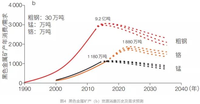 2018?年,我國鐵(粗鋼)、錳、鉻的消費量分別為?8.35?億噸、1?205?萬噸和?645?萬噸。其中,鐵和錳的年需求量峰值已在?2015?年前后到達,越過了?9.2?億噸和?1?180?萬噸的峰值,目前消費平緩并開始緩慢下降;鉻的需求峰值將在?2025?年之前到來,屆時年需求量是?1?880?萬噸(鉻礦石)(圖?4b)