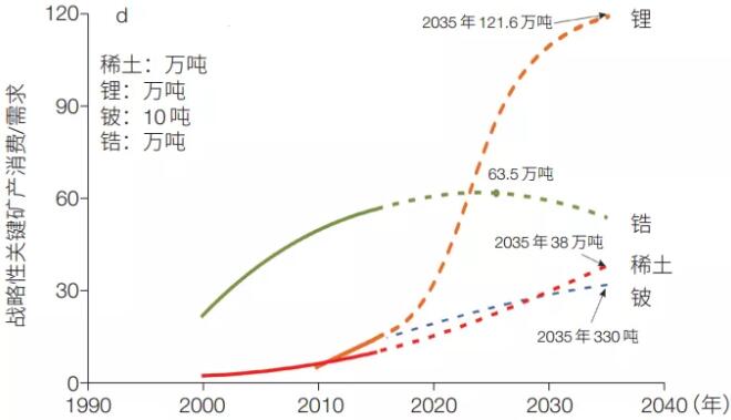 戰略性關鍵礦產包括稀土、鋰、鍶、鈹、鋯、鈮、鉭、鎵、鍺和銦等,未來需求大多將保持持續增長(圖?4d)。2018?年,我國稀土、鋰消費量分別為?10.4?萬噸和?3.5?萬噸,預測到?2035?年其需求將保持持續增長。稀土主要應用領域需求均呈增長態勢。鋰主要應用部門為新能源汽車領域,約占?2/3;隨著電動汽車產業不斷發展,未來鋰的需求將呈快速增長趨勢。
