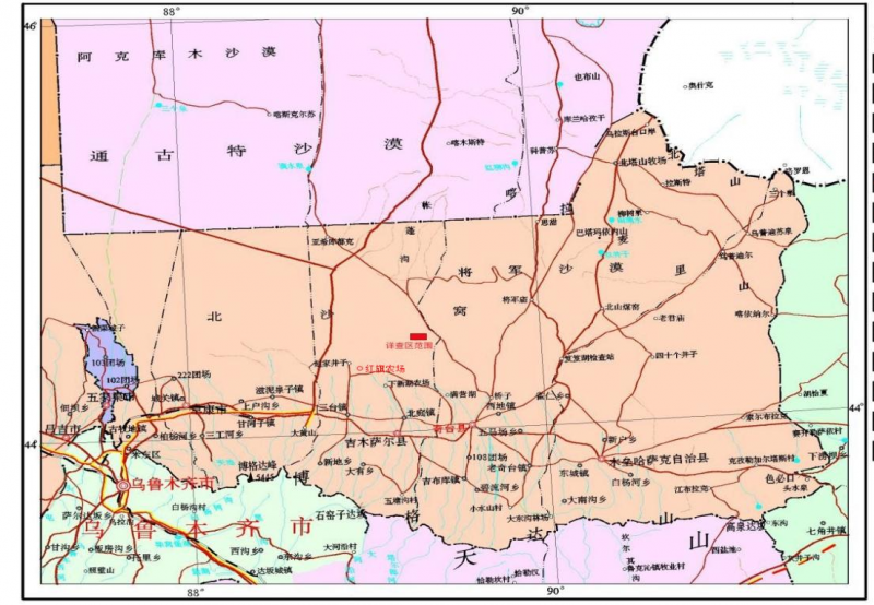 地理位置:準噶爾盆地東南部古爾班通古特沙漠邊緣,行政區(qū)劃隸屬新疆生產建設兵團第六師管轄,位于五家渠市東側130km處,吉木薩爾縣場北側35km處,距紅旗農場場部約16km。自紅旗農場場部經二幸線鄉(xiāng)村公路及便道可直接到達詳查區(qū)的北部,交通較為便利。范圍:東經89°11′46.00″~89°12′54.00″;北緯44°17′46.00″~44°18′50.00″。