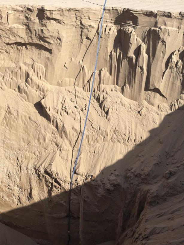 5.礦體特征:該建筑用砂(風積砂)礦體形態呈四邊形,南北方向寬0.6千米,東西方向長1.2千米,出露標高1049-1034米,普查區范圍面積為0.6149平方千米。礦體向四周均延伸至普查區外,根據普查區內淺井揭露,淺井控制深度1.8~6米,平均深度3.89米;圈定礦體厚度0~3.9米,平均厚度1.8米。礦體直接出露地表,主要為土黃色細砂土,粒度較細,0.075~0.3mm,成分主要為石英、長石及云母,分選較好。